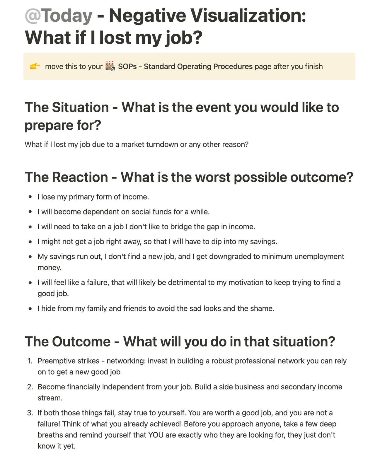 Here is an example of me going through the exercise of Negative Visualization. It greatly enhances the chance of you reacting the way you want in high-stress, high-stakes situations, since you already went through the mental effort of dealing with it preemptively. 👇
