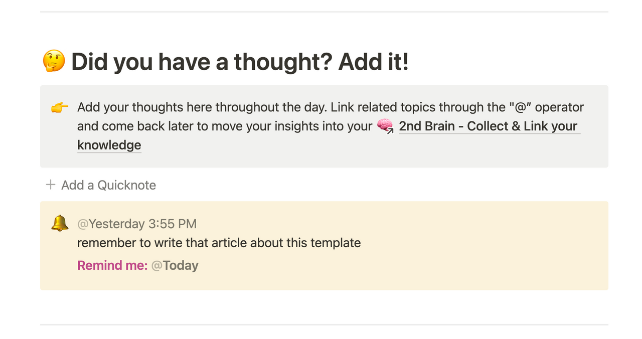 - Add quick notes and reminders throughout the day and add them to the different sections of your life (e.g. Second Brain)