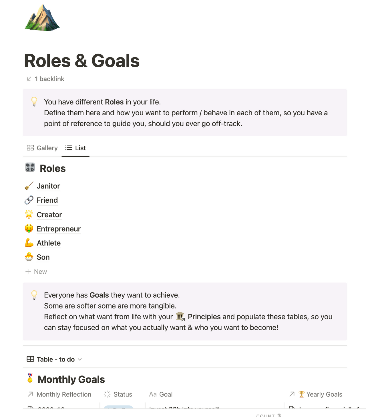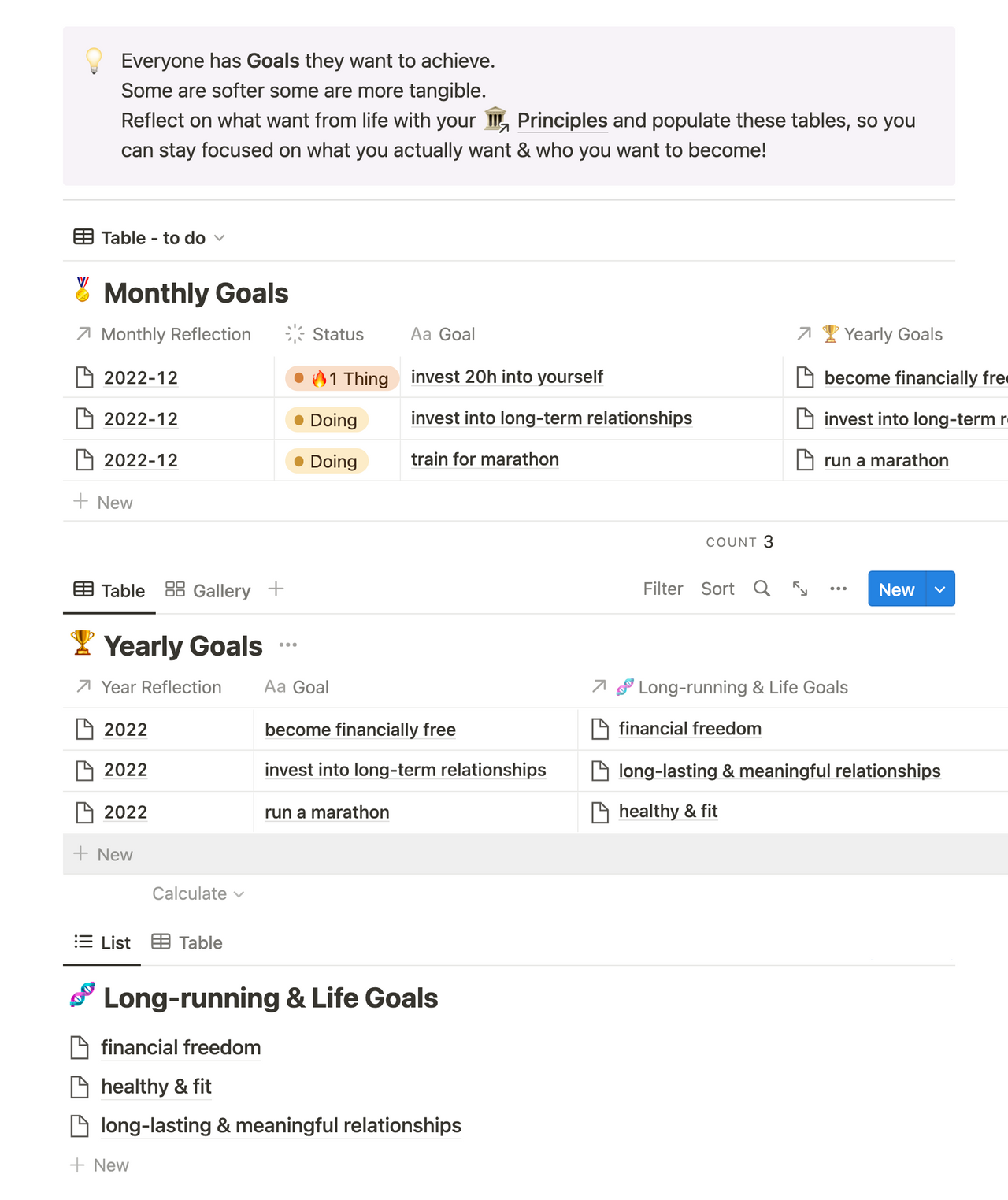 All of your goals are aggregated on their own page in their respective databases, so you can have a simple dashboard view of all the things you want to do this year, and how it is going. We found it useful to come back here during weekly, monthly, and yearly planning to gain a birds-eye perspective.