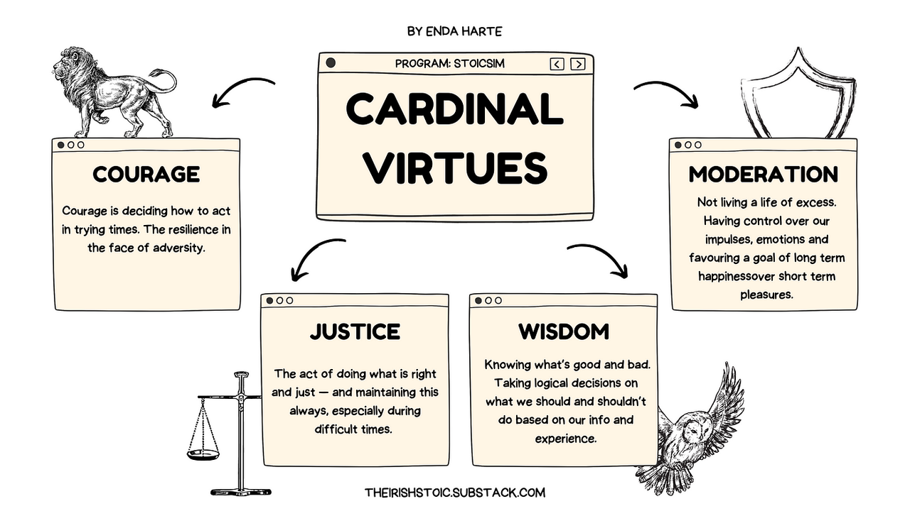 The four cardinal virtues - Wisdom, Justice, Courage, and Temperance - form the ethical foundation of Stoicism. Understanding and cultivating these virtues is key to living a fulfilling life according to Stoic principles. In my own journey with Stoicism, I've found that regularly reflecting on these virtues provides a powerful framework for personal growth and ethical decision-making.